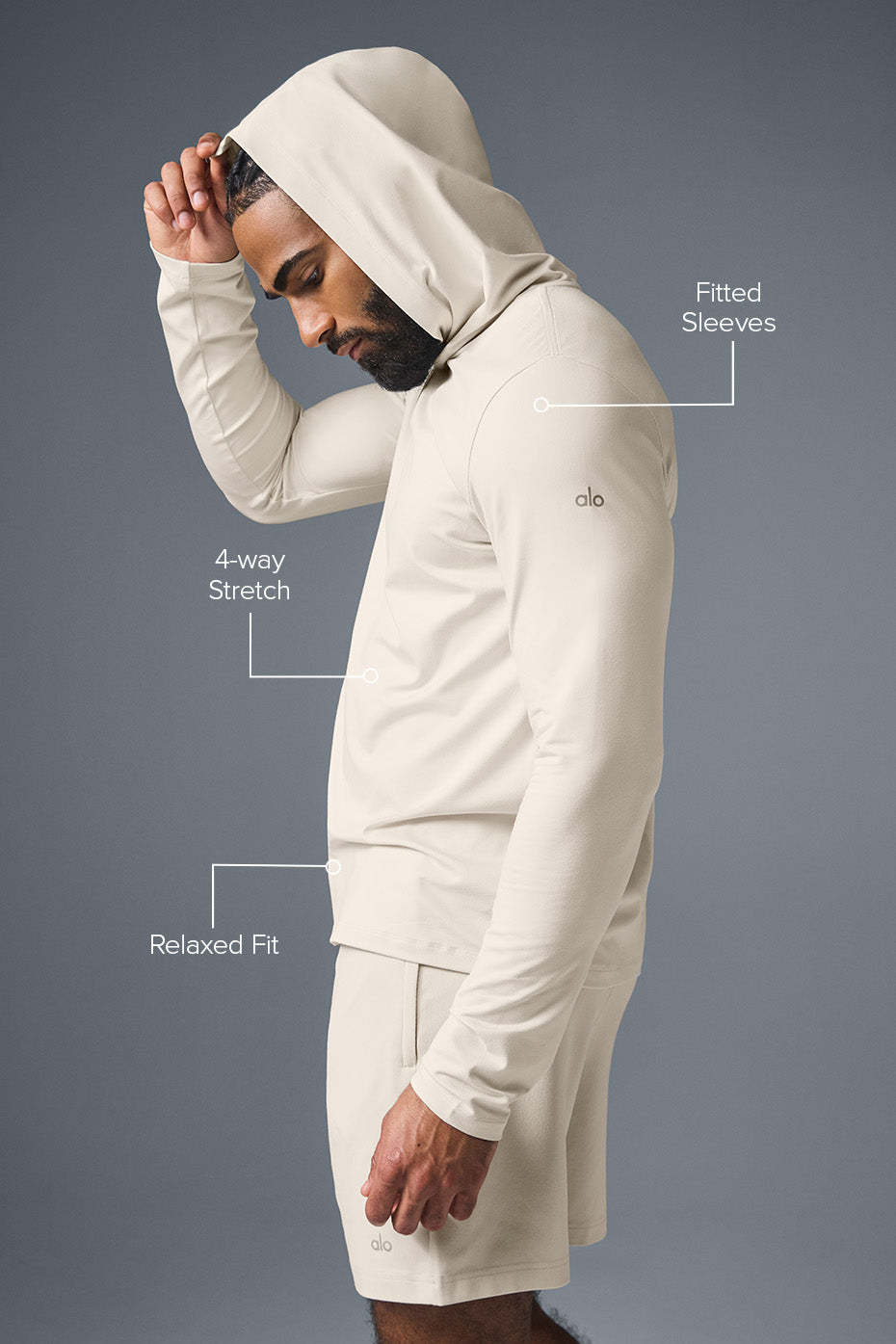 Long sleeves with a pullover hoodStretchy, breathable poly-spandex with a sueded finish