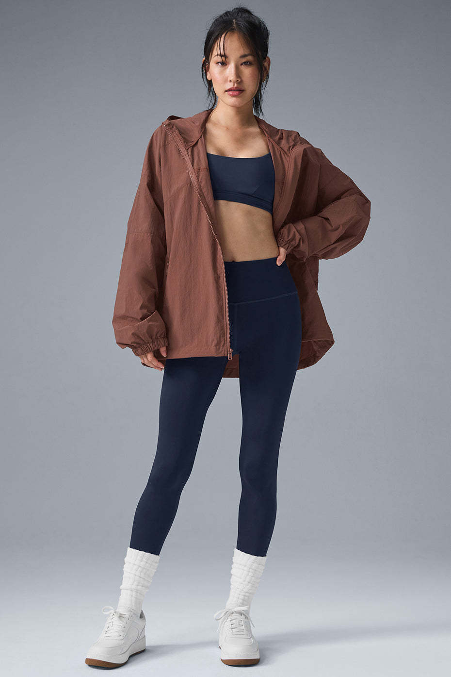 Light coverage and serious protection—that’s the Vantage Track Jacket. It has technical features like a structured hood, a full-zip front that covers the neck, cuffed sleeves, and a bungee hem that’s slightly longer in back. Fitwise, it feels cool and modern with dropped shoulders and a loose body. Wear it for running, training, or stepping outside in brisk weather.