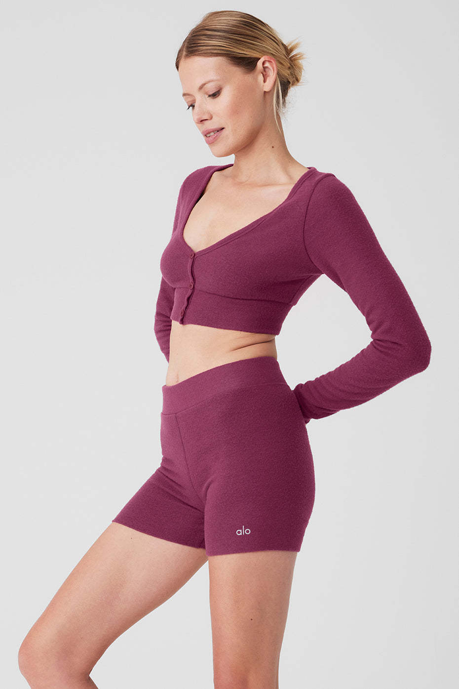 Done in cloud-soft Alolux with a brushed finish that only gets better with time, this cute cropped cardigan turns everyday activites into moments of luxury. And since it’s meant to be worn as a shirt, the buttons dotting down the front are strategically fixed to prevent gapping. Just add the matching shorts, grab a mug of hot cocoa and find the nearest fireplace.