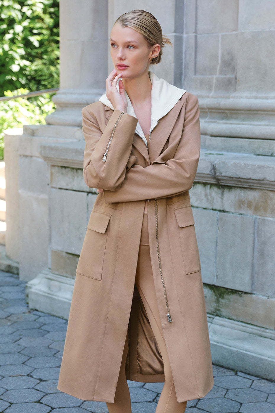 Classic with a cool twist, the Formation is the trench you’ve been searching for. The main silhouette is standard, with notched lapels, storm flaps, flap pockets and a softly structured, slightly stretchy cotton-blend fabric. But the best part? The flattering, contrasting waist panel that highlights the figure and makes this trench feel totally fresh. Leave the front zipper undone for a more laid-back vibe (with a workout set), or zip it up for a more tailored look that works from day to night.