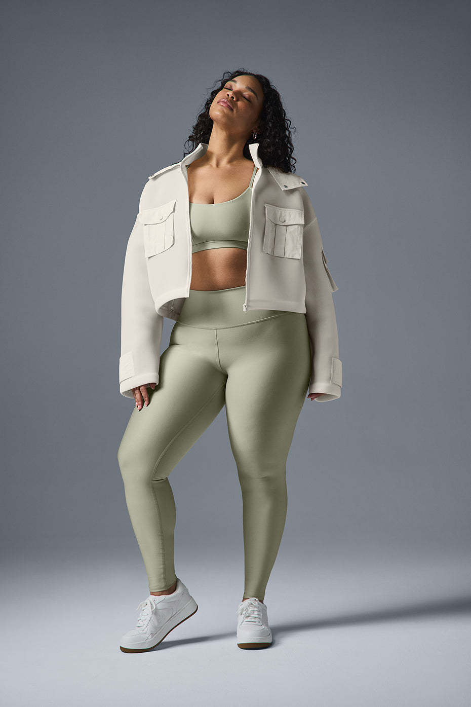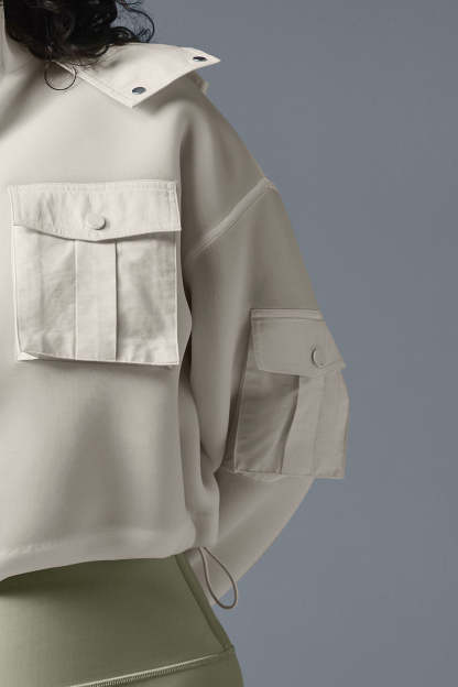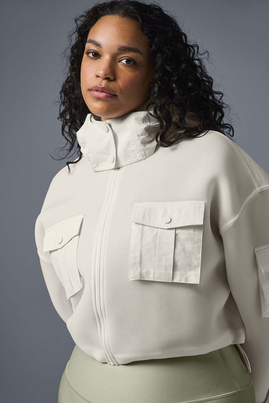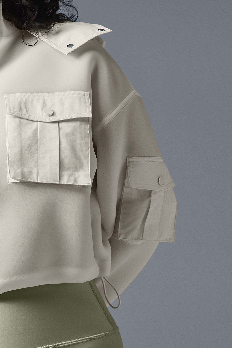 Cutest cargo jacket ever. The cropped cut looks just as chic over bare skin as it does a tee or dress, and it’s made from a stretchy, springy scuba material and finished with contrasting cargo snap pockets, a snap front, cuffs, a hood and a back storm flap. The silhouette is boxy, with bottom bungees to cinch the fit. Wear it with baggy jeans for a sporty look or a matching set to walk to your workout.