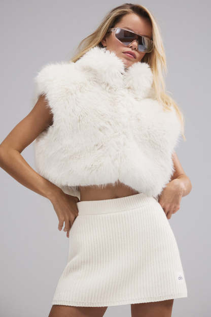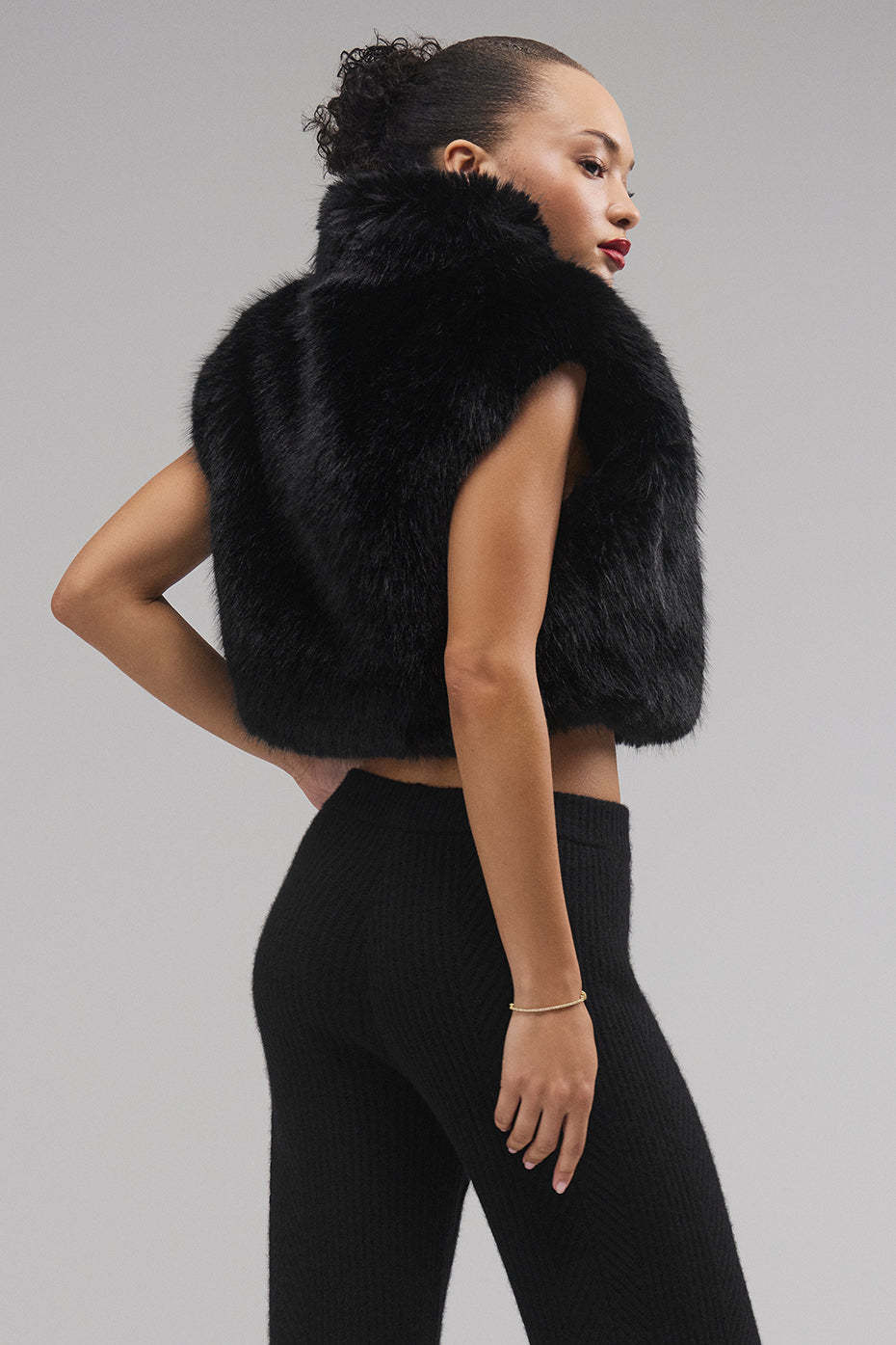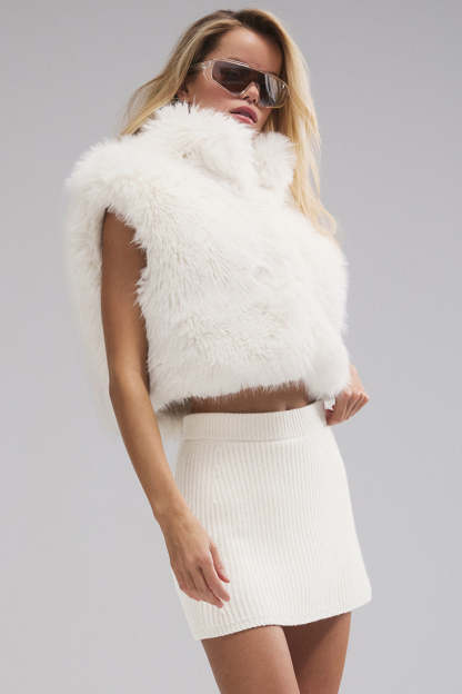 Yes—this faux fur vest is really as abundantly soft and fluffy as it looks on your screen. The boxy, cropped hem emphasizes the natural waist, and a stand collar and extended shoulders balance the look. Secure it with the hidden hook-and-eye closures, or wear it open to show off the slinky slip dress you’ll wear underneath.