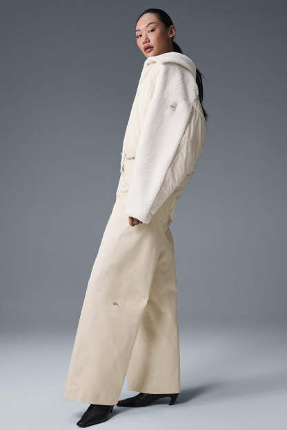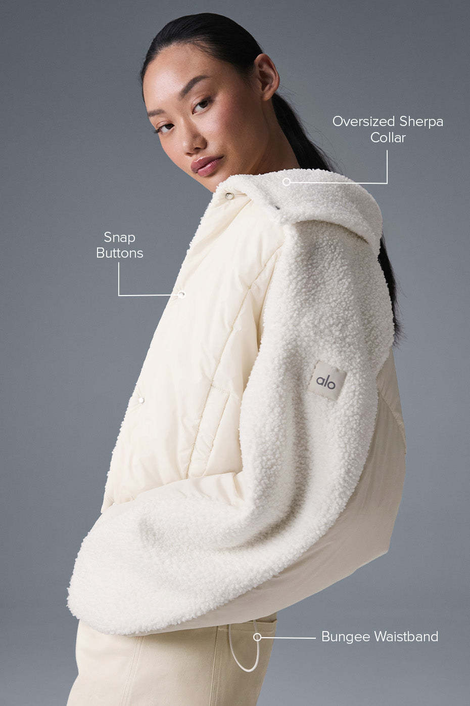 Slightly oversized—designed for a boxy and puffy silhouetteLightly-filled memory woven fabric with sherpa details